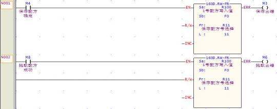 應(yīng)用永宏的FUN160檔案存儲器可方便的實現(xiàn)對配方的保存與提取,存儲容量大且不占用寶貴的內(nèi)部暫存器。