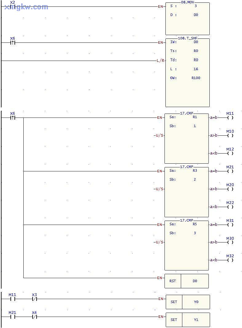2. 當(dāng)凸輪旋轉(zhuǎn)一圈,傳送帶上的物品從一個(gè)定點(diǎn)移到另一個(gè)定點(diǎn), X6由OFF→ON變化一次, T-SHF指令執(zhí)行,R0-R15的內(nèi)容往左移位一個(gè)寄存器;同時(shí), CMP指令執(zhí)行,在定點(diǎn) 2(R1)判斷是否為 A產(chǎn)品、在定點(diǎn) 4(R3)判斷是否為 B產(chǎn)品、在定點(diǎn) 6(R5)判斷是否為 C產(chǎn)品,每次比較完成后, RST指令被執(zhí)行, D0被復(fù)位。